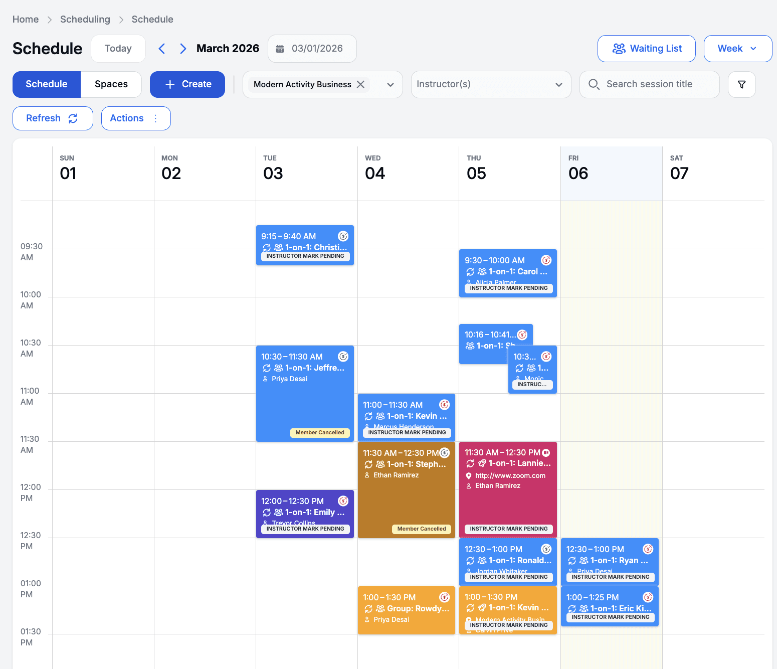 Private lessons, group classes, and space rentals all live in one intelligent calendar — so your staff stays organized and clients can book without friction.