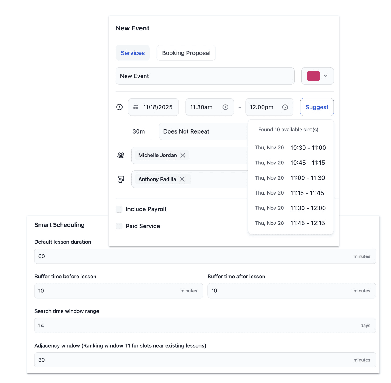 Automatically match instructors, rooms, and availability so every booking fits perfectly into your schedule.